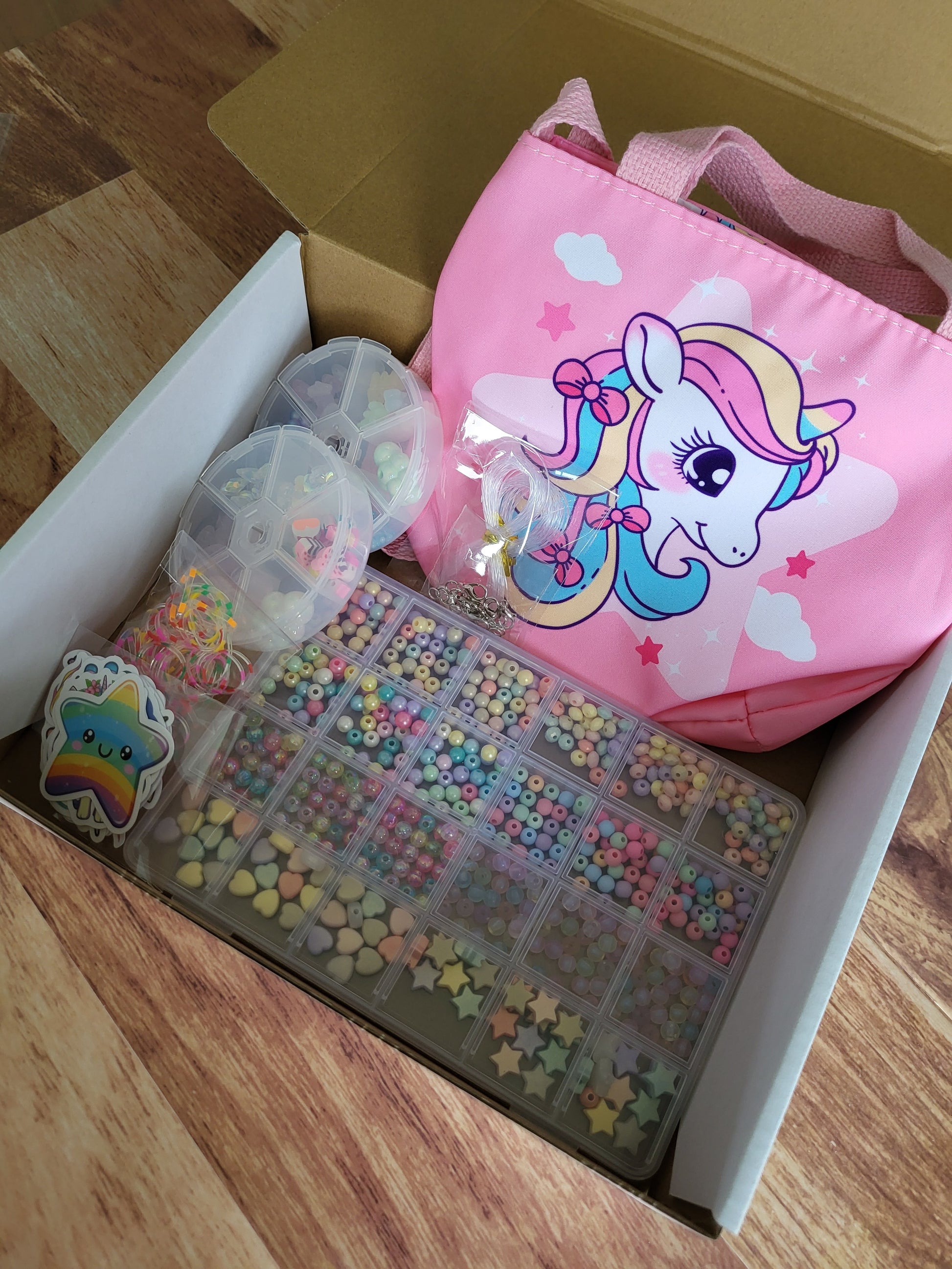 Contient: des perles et accessoires, un sac à bandoulière, des autocollants, des petits élastiques à cheveux